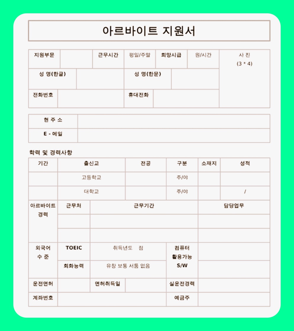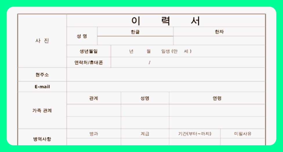 만약 작성방식이 필요없고 바로 이력서 양식 다운을 원하시는분들은 글 가장 아래 홈페이지를 바로 이용하시면 됩니다.