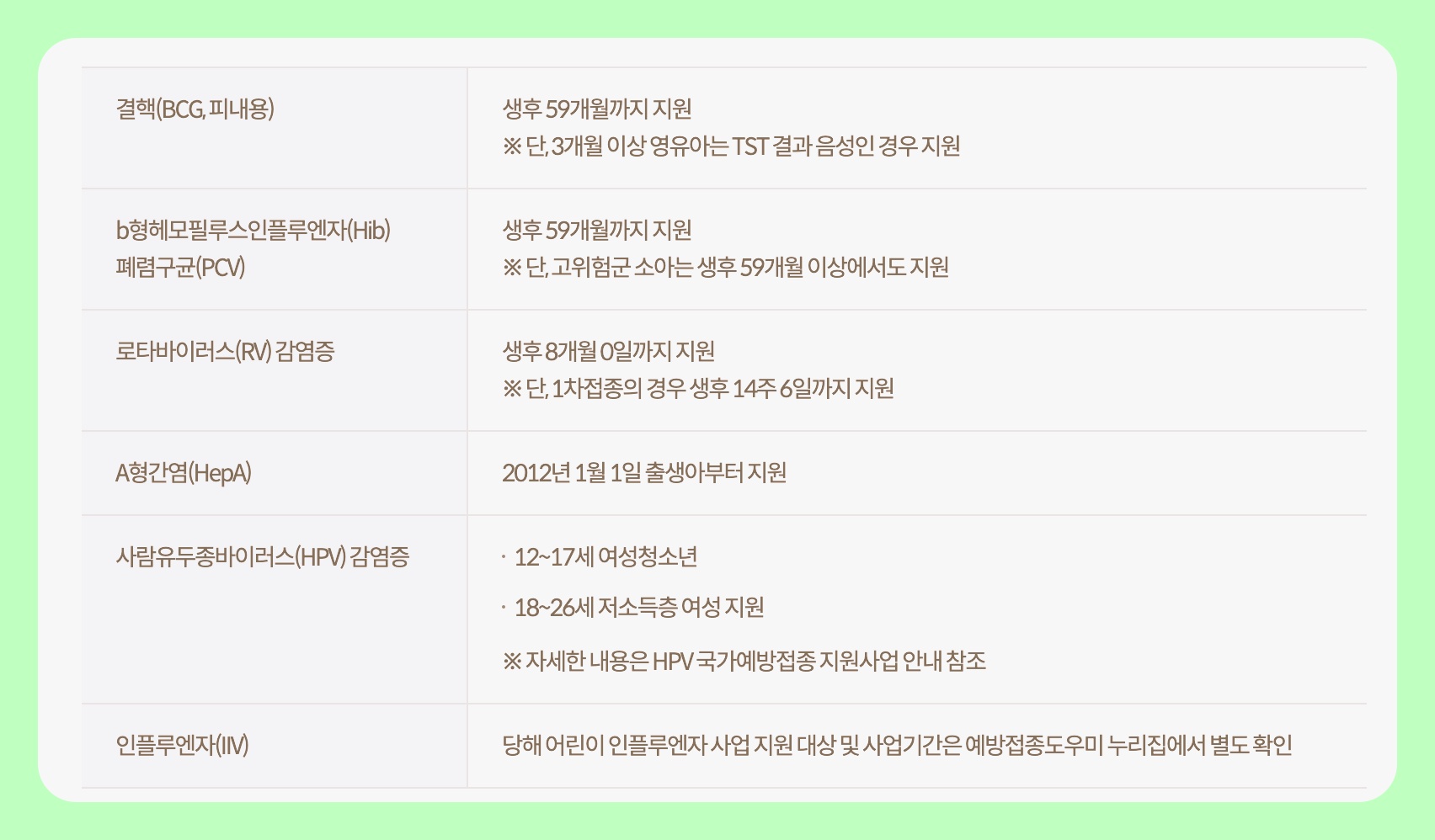 어린이의 경우, 6개월부터 13세까지가 무료 접종 대상입니다. 2회 접종이 필요한 경우와 1회 접종이 필요한 경우에 따라 시작일이 다릅니다.